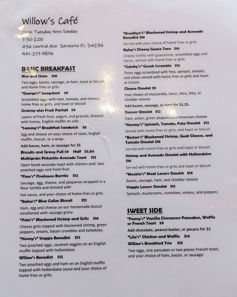 Located in the heart of Sarasota on Central Avenue, Willow's Cafe invites breakfast lovers to explore its delightful menu. With a focus on hearty Benedicts, diners can choose from options like the Country Benedict with savory sausage gravy, or the vibrant Veggie Benedict that showcases fresh sautéed vegetables. For a sweet touch, their French toast and pancakes are a hit, bringing flavors that delight each palate.